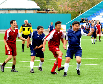 "Матчем века" назвали зрители товарищеский матч по футболу между командой Правительства и объединенной командой городского хурала и мэрии, прошедшем на обновленном стадионе 5-летия Советской Тувы.