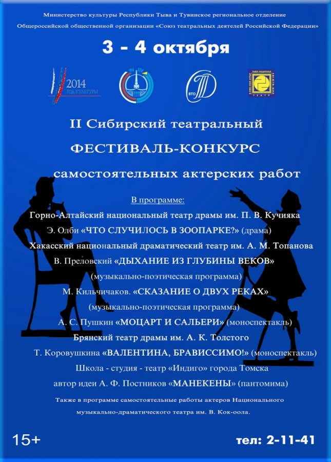 3 и 4 октября на сцене Национального музыкально-драматического театра им. В. Кок-оола состоится IIСибирский театральный фестиваль-конкурс самостоятельных актерских работ, посвященный 100-летию единения России и Тувы и основания города Кызыла. В конкурсе примут участие шесть актеров из других регионов – Алтая, Хакасии, городов Брянск, Томск – и три актера тувинского театра.