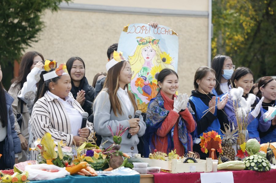 Гвоздь программы - копченая и запеченная баранина, курица, которые были раскуплены гостями ярмарки за несколько минут. Первокурсница Долума Идам в красивом головном уборе из осенней листвы и ягод подробно рассказала посетителям и членам жюри о выставке физико-математического факультета, над которой работали сами студенты. А студенты филологического факультета из своей выставки устроили целое тревел-шоу. Покупатели должны были отгадать страну по определенной осенней поделке или блюду – мини-версия символа Рио-де-Жанейро и Бразилии статуя Иисуса Христа, изготовленная из кабачка и капусты, а также знаменитая лондонская красная телефонная будка из сладкого перца и российский крокодил Гена из свежего огурца.