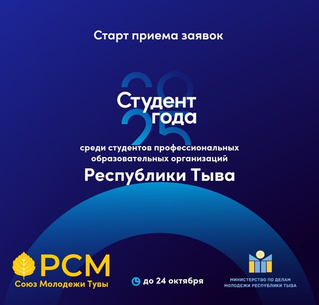 Союз молодежи Тувы вместе с Министерством по делам молодежи Республики Тува объявляют прием заявок на участие в региональном этапе премии «Студент года – 2025». Премия учреждена для выявления талантливых студентов учебных заведений среднего профессионального образования региона, добившихся значительных успехов в учебе, науке, творчестве, спорте и социальной активности. Победителей ждет возможность представить свою республику на всероссийском уровне, участвуя в финальном этапе Национальной премии «Студент года».
