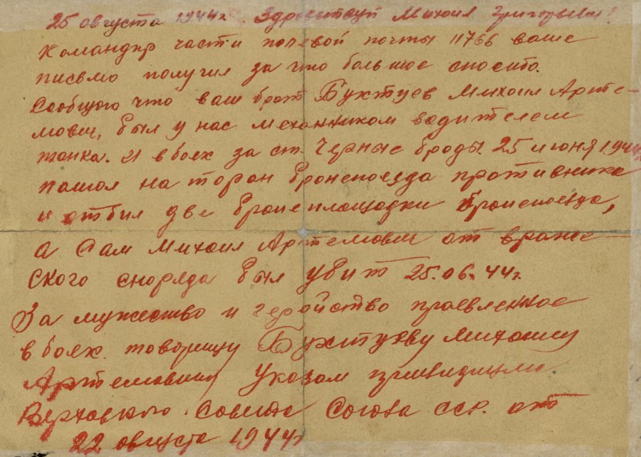 В фондах Белорусского государственного музея истории Великой Отечественной войны хранится письмо Бухтуевой Раисы Семёновны, матери Героя Советского Союза Михаила Артемьевича Бухтуева, 6 января 1945 года.