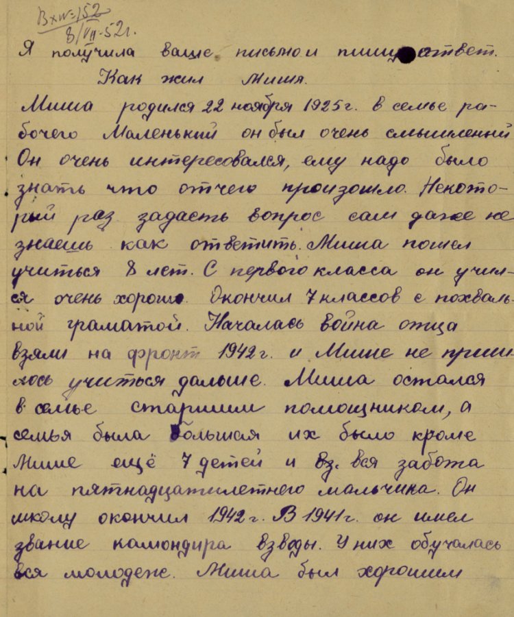 В письме она рассказывает о детских и юношеских годах своего сына: он был очень смышленый, всем интересовался, хорошо учился – окончил 7 классов с похвальной грамотой. Когда началась Великая Отечественная война, учеба мальчика прервалась, да и отца забрали на фронт – 3 сентября 1942 года он погиб. В многодетной семье, в которой кроме него было еще 7 детей, в 15 лет Михаил стал старшим помощником. Работал он электриком и радистом. Жили очень бедно. В Красной Армии служил с 8 июля 1943 года.