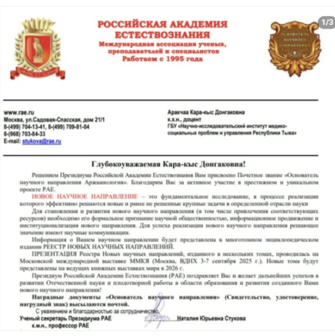 Решением Президиума Российской Академии Естествознания тувинской ученой Кара-Кыс Донгаковне Аракчаа, председателю тувинского отделения Русского географического общества, в конце декабря 2025 года было присвоено Почетное звание «Основатель научного направления Аржаанология», что по сути является признанием предмета ее исследований как отдельного научного направления.