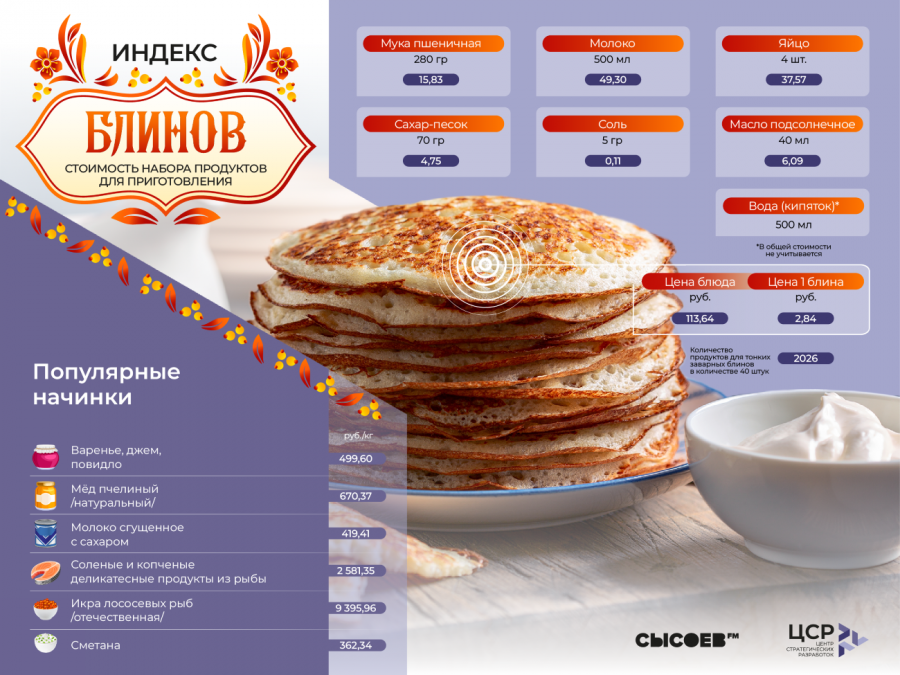 Впервые за последние годы главное блюдо Масленицы существенно подешевело. Центр стратегических разработок (ЦСР) опубликовал среднюю стоимость набора продуктов для приготовления блинов в России на основе данных Росстата. Она снизилась на 4,7% по сравнению с прошлым годом и составила 113,64 рубля, сообщили Тува-Онлайн в Росстате.