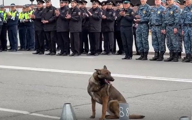 После окончания совместного инструктажа под звуки торжественного марша перед собравшимися в последний раз прошли три служебные собаки Центра кинологической службы МВД по Республике Тыва - немецкие овчарки Берта, Эшли и Марс, которые вышли на заслуженный отдых.