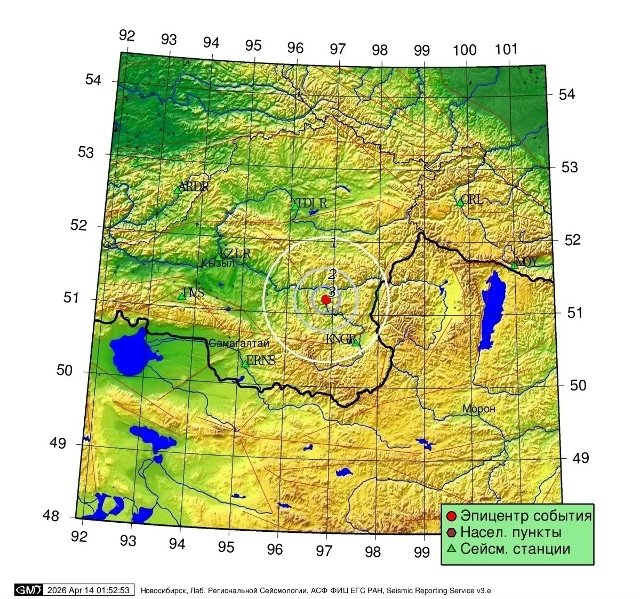 25 апреля в 16:40 по местному времени зарегистрировано сейсмическое событие магнитудой 5,3 на территории Бай-Тайгинского района в 25 км северо-западнее от с. Кызыл-Даг.