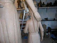 Работа в мастерской Александра Ойдупа начинается с 6 часов утра. Скульптору помогает художник Хеймер-оол Донгак, участвовавший в создании уже нескольких памятников в столице Тувы, например, бронзового всадника на быке на Музейной площади. Специально для этого заказа мастера изготовили крутящуюся основу, чтобы работать было удобнее. Фотоснимки готовой скульптурной группы из глины – русская учительница с двумя учениками – будут направлены литейщикам в город Улан-Удэ. Те, в свою очередь, укажут, как необходимо формовать. Формы будут опять же отправлены в Улан-Удэ, где и будет из бронзы отливаться памятник. Установить его планируется к профессиональному празднику педагогов – Дню Учителя.