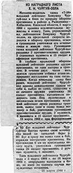 По итогам юбилейного Года Победы готовится к изданию Народная Летопись "Моя Победа", в которую войдут малоизвестные страницы участия Тувы в Великой Отечественной войне, воспоминания фронтовиков, события юбилейного года. Помимо новых исследовательских материалов в книге будут опубликованы выдержки из старых газет, изданий, посвященных Великой Отечественной войне. Мы приводим очерк Сергея Бакизовича Пюрбю о Герое Советского Союза, легендарном танкисте Хомушку Намгаевиче Чургуй-ооле.