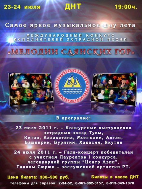 Второй Международный конкурс исполнителей эстрадной песни «Мелодии Саянских гор» пройдет в cтолице Тувы 23 и 24 июля – в рамках празднования 90-летия республики. Заявки на участие уже подал известные в своих странах и регионах исполнители: Нургали Турлымбеков (Казахстан), Галдан Шархуу (Монголия), Эрке Ерехонов (Алтай), Марсель Кутуев, Айдар Хамлин (Башкирия), Чимит Санжмимитупов, Булат Бадмаев (Бурятия), а также звезды эстрады Тувы.