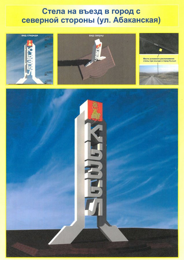 Полностью за счет этой организации совместно с ООО «Дороги Тувы» будут сделаны и установлены две стелы – с южной и северной стороны Кызыла. Стоимость одной стелы составляет около одного млн рублей. С южной стороны стелы будут установлены в районе девятого километра трассы Кызыл-Эрзин, а с северной стороны – между перекрестком трасс Кызыл–Абакан и Кызыл–Кара-Хаак и круговой развязкой трассы Кызыл–Абакан.