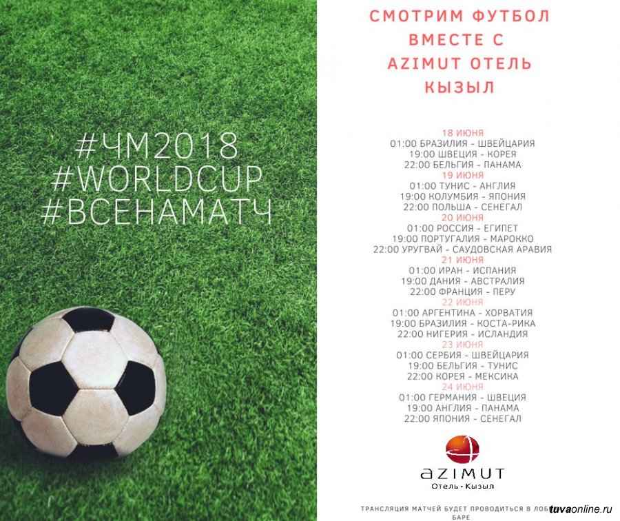 Новый отель «Азимут-Кызыл» установил в лобби-баре гостиницы телевизионный экран с полутораметровой диагональю, который позволяет смотреть матчи Чемпионата мира по футболу в компании, заказав предложенные в Лобби-баре напитки и еду. Как сообщает страница ВКОНТАКТЕ vk.com/azimut_kyzyl, забронировать такой просмотр можно по телефону 37037.