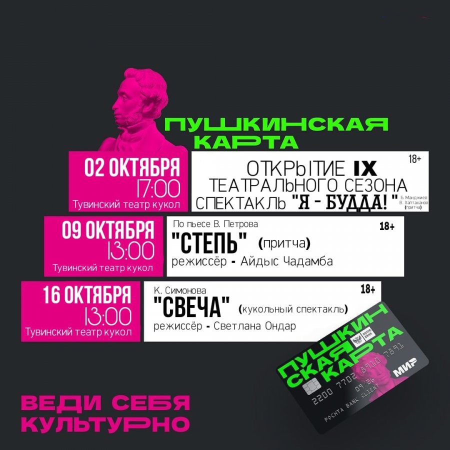 На спектакли Театра кукол Тувы в новом сезоне - с Пушкинской картойВ эту субботу, 2 октября - открытие нового сезона в Тувинском государственном театре кукол. На своих страницах в социальных сетях Театр напоминает своим молодым зрителям, что на  спектакли можно прийти, оформив Пушкинскую карту.