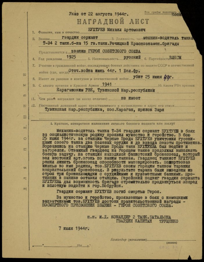 Комсомолец гвардии сержант М.А. Бухтуев отличился 25 июня 1944 года в боях при освобождении Беларуси – в наступлении на Бобруйском направлении. Из биографических сведений и наградного листа М.А. Бухтуева, представленного 22 августа 1944 года к званию Героя Советского Союза посмертно, известно следующее: